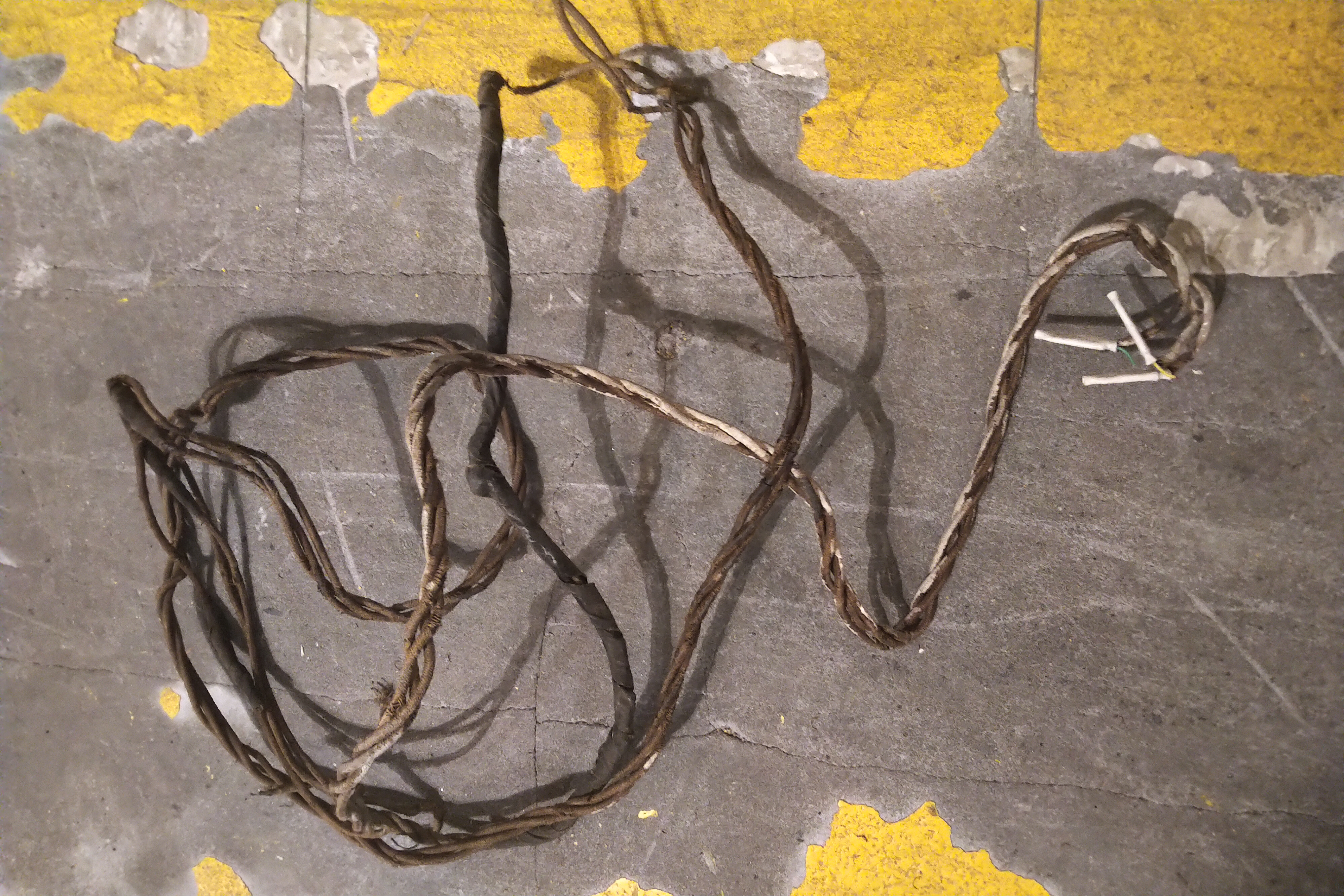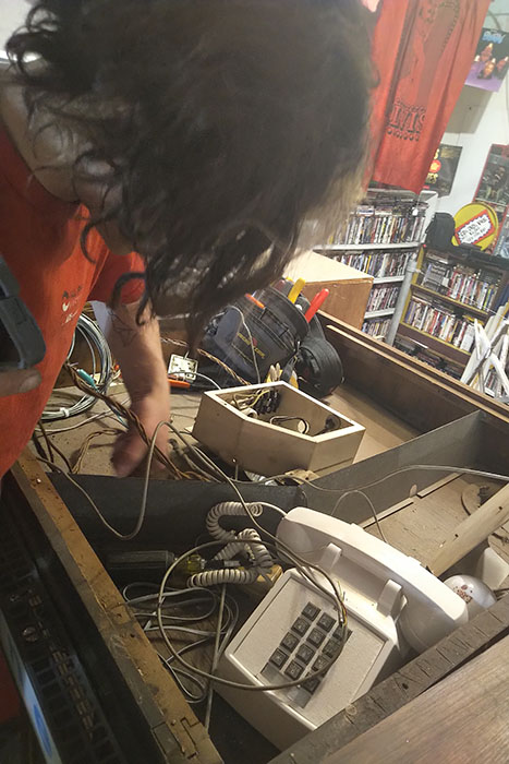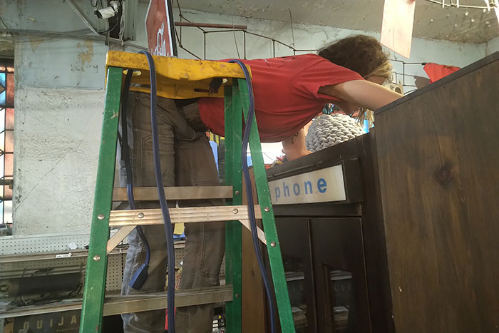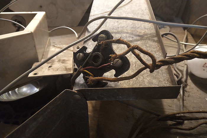 When running a phone line up to the vintage phone booth, we noticed that the old cloth-covered AC wiring on top was deteriorating and needed to be replaced.