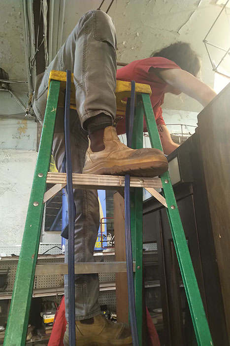 Luckily we have a friend Lou who is an electrician (and formerly a ballet dancer, making her uniquely skilled at balancing on the ladder to work at an awkward angle above the booth) and she was excited to help out with this portion of the project!.